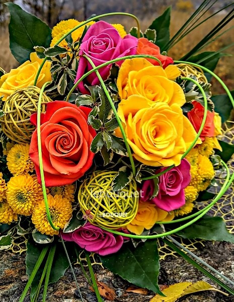 Un tripudio di tonalità allegre e avvolgenti, questo bouquet combina rose di diverse sfumature con un assortimento di fiori misti. I colori si intrecciano armoniosamente creando un effetto dinamico che cattura immediatamente lo sguardo.