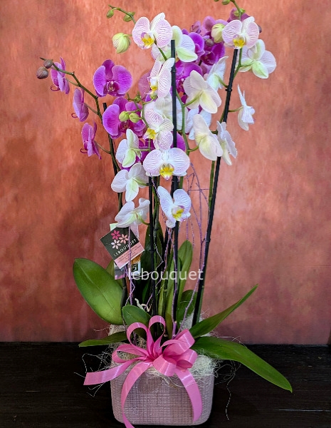 Elegante composizione di due orchidee Phalaenopsis dai colori armoniosamente contrastanti, perfette per donare un tocco di raffinatezza a qualsiasi ambiente. Le piante, caratterizzate da fiori delicati e duraturi, sono disposte con cura all’interno di un vaso in ceramica dal design moderno, che ne valorizza la bellezza naturale.